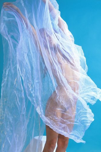 Красивая голая девушка замоталась в тюль
